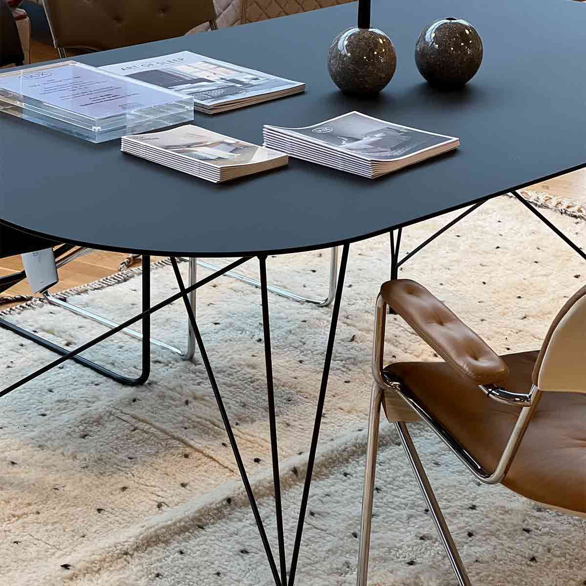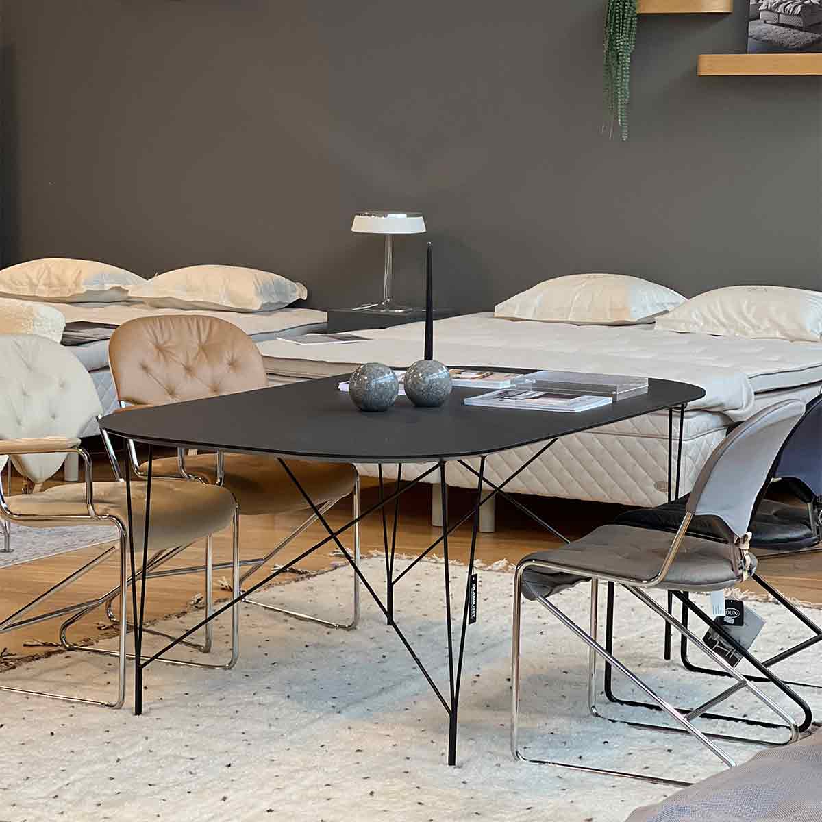 Inter matbord är designat av DUX Design Team 1986. Här finner du utförandet i svart nanolaminat och med svartlackerat underrede. Bordet mäter 100×180 cm.
