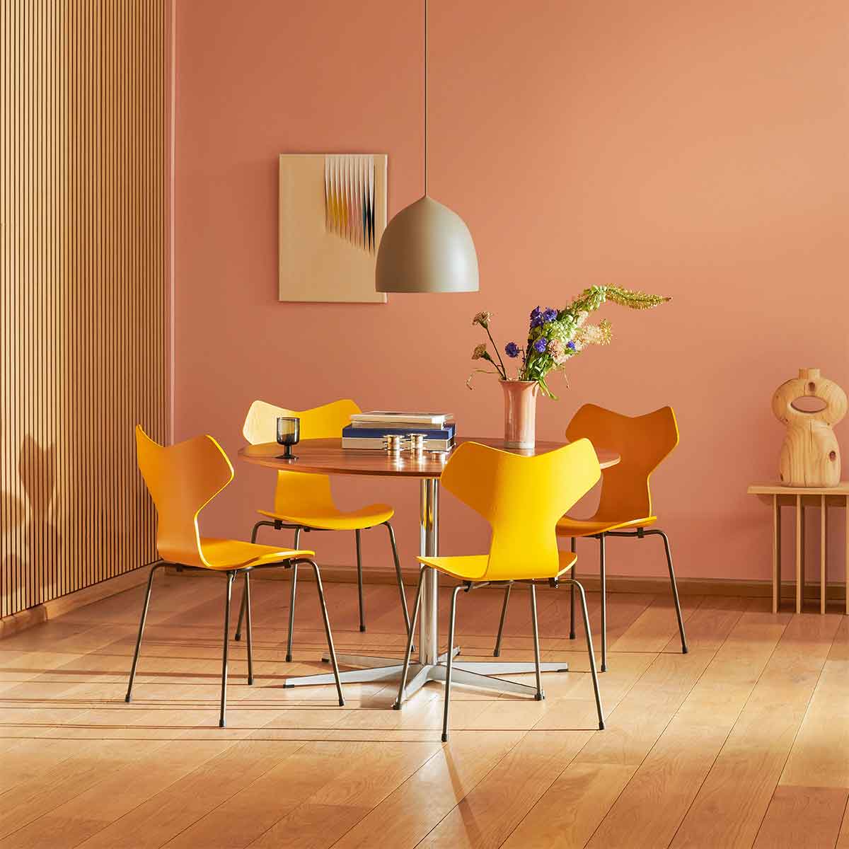 3130 Grand Prix Askfanér från Fritz Hansen är en ikonisk design av Arne Jacobsen som kombinerar grafisk skärpa med elegant enkelhet. Stolen introducerades första gången 1957 på Designers’ Spring Exhibition vid Danish Museum of Art & Design i Köpenhamn. Samma år ställdes den ut på Triennalen i Milano, där den belönades med utställningens högsta utmärkelse Grand Prix, vilket också gav stolen dess namn.