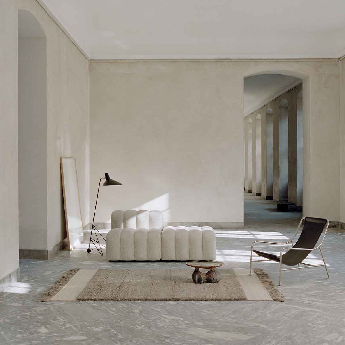 Humble Act Matta från Linie Design får sitt lågmälda uttryck genom ett skickligt hantverk och en omsorgsfull kombination av tonala och strukturella kontraster. Den tjocka mjuka luggen ramas in i vardera ände av flätvävda partier och långa svepande fransar. Tillsammans skapar de ett spel av dimensioner och former som låter de ofärgade garnerna komma till liv. Mattan är tillverkad i mjuk nyzeeländsk ull med en organisk bomullsväv, två material valda för sin hållbarhet och sin naturliga rustika skönhet.