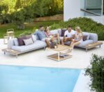 Bordsskivorna kan fås i en rad olika material, beroende på vilken look man vill ha. Soffan är tillverkad i mjuka Cane-line AirTouch med Cane-Lines dyna med de populära systemen QuickDry och Airflow. Det innovativa och moderna loungekonceptet har formgetts av den danska designerduon Foersom & Hiort-Lorenzen MDD.